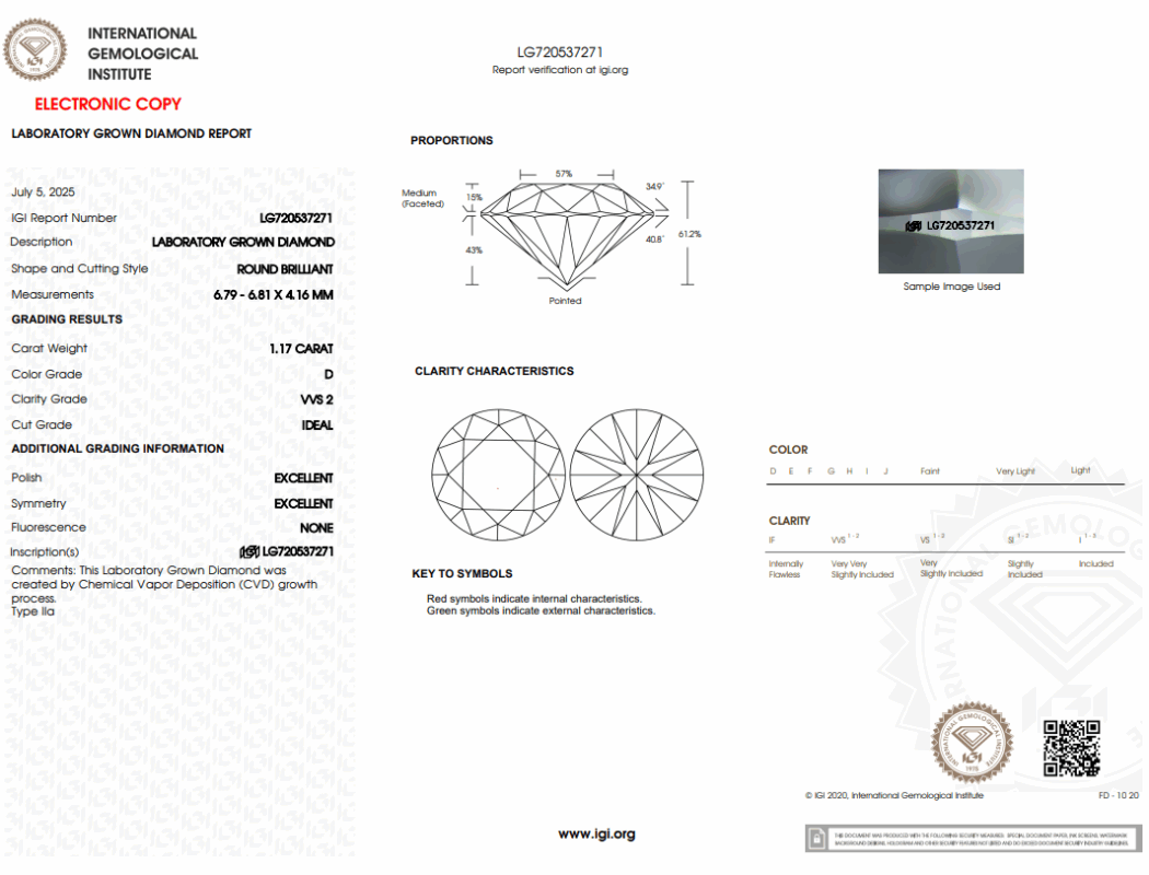 หมายความว่า บนเพชรจะมีสลักเลเซอร์ว่า IGI LG720537271เมื่อตรวจสอบกับ ใบเซอร์ IGI จะตรงกับข้อมูลเพชรเม็ดนั้น ช่วยให้มั่นใจว่า เพชรแท้และถูกต้องตามใบเซอร์