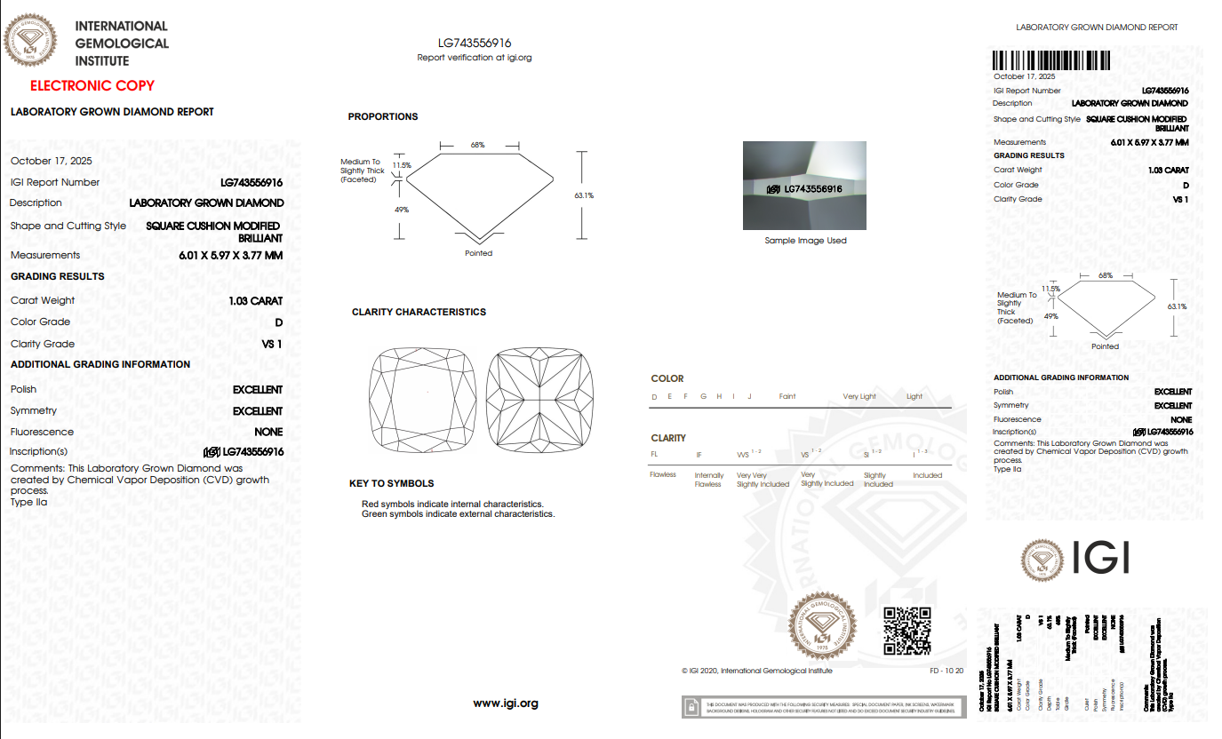 เพชรทรงคุชชั่นขนาด 1.03 กะรัต นี้เป็นอัญมณีที่มีความสมบูรณ์แบบ ด้วยสี D ที่ให้ความขาวใสไร้สีสมบูรณ์ พร้อมกับระดับความสะอาด VS1 ที่ทำให้เพชรดูบริสุทธิ์และเปล่งประกายได้สูงสุด เหมาะสำหรับผู้ที่ต้องการเพชรที่มีความหรูหราและสง่างาม สามารถใช้เป็นของขวัญล้ำค่า หรืออัญมณีสำหรับแหวนหมั้นและแหวนแต่งงานที่สะท้อนถึงความรักนิรันดร์