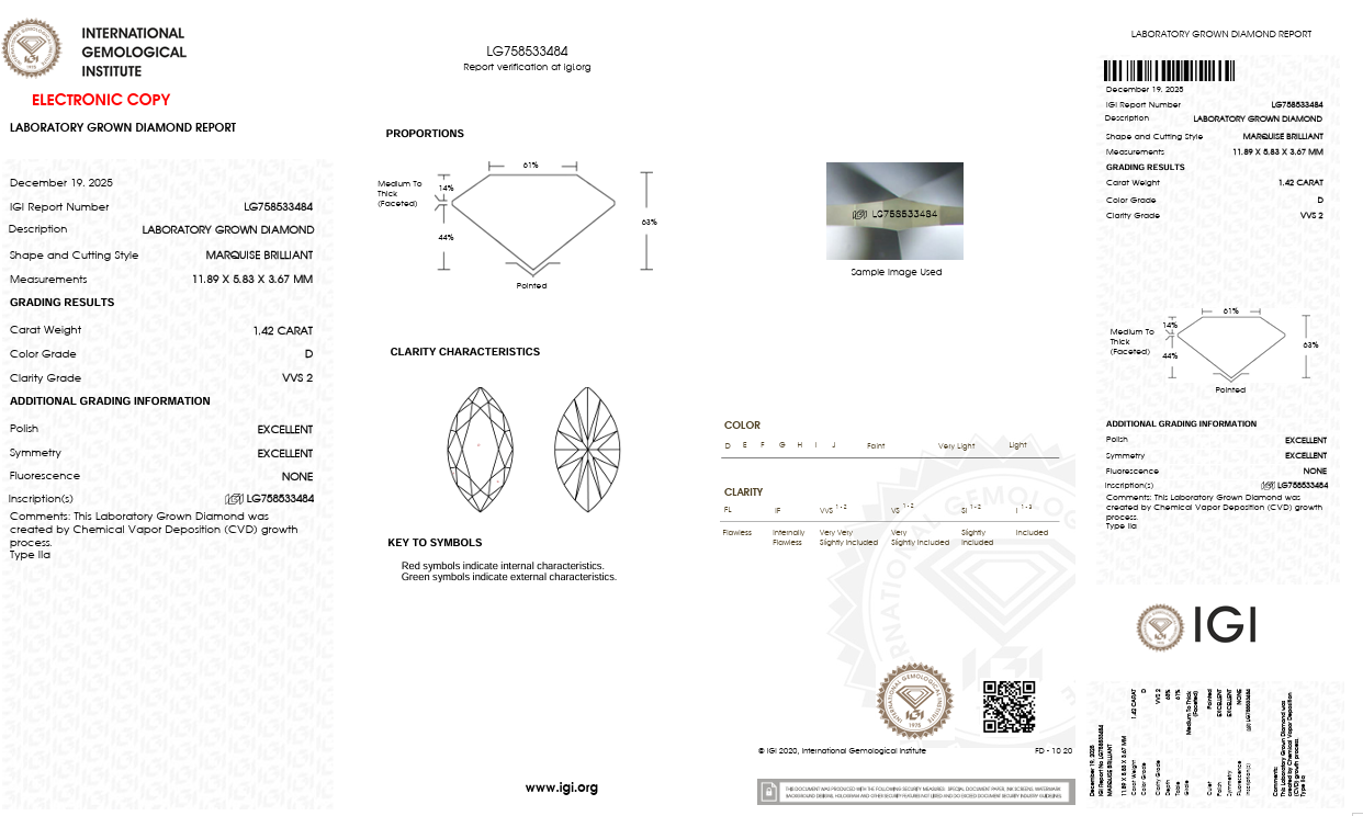 เพชรทรงมาร์คีย์ ขนาด 1.42 กะรัตนี้ไม่เพียงแค่มีขนาดที่เหมาะสม แต่ยังสะท้อนความงดงามและความหรูหราอย่างแท้จริง โดยมี น้ำ D ที่ไร้สีและ ความสะอาด VVS2 ซึ่งทำให้เพชรนี้มีความบริสุทธิ์และเปล่งประกายอย่างสมบูรณ์แบบ เหมาะสำหรับผู้ที่ต้องการเพชรที่เปล่งประกายและมอบความสง่างามเหนือกาลเวลา โดยเฉพาะในแหวนหมั้น แหวนแต่งงาน หรือเครื่องประดับอื่นๆ ที่ต้องการความคลาสสิกและความหรูหราที่ไม่เคยล้าสมัย